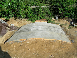 I poured the roof in 3 sections, for that is the most concrete I can handle working alone. The seams are nearly invisible from below, and are waterproof. It was not difficult creating the arch in the top using standard concrete. The radius of the top arch is about 6 inches larger than below.