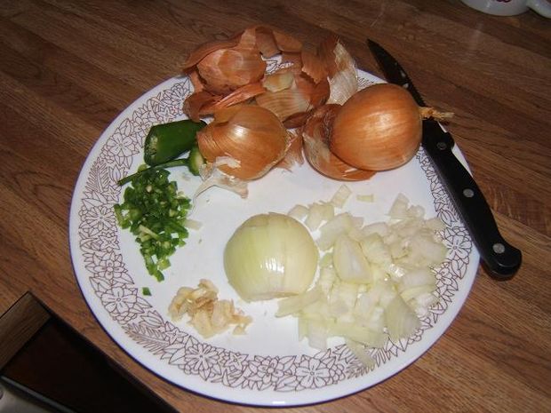 Chop up the 2 onions, the garlic and half or 3/4 of the jalapeno pepper. The seeds can be left in, since they’re hot too.