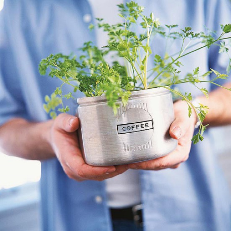 Plant your favorite herbs in your old aluminium kitchen canisters for a cool looking indoor herb garden. Just make sure you drill holes in the bottom of the canisters. Place them on a sunny location and water them regularly – you will have fresh herbs to use in your kitchen throughout the whole year.