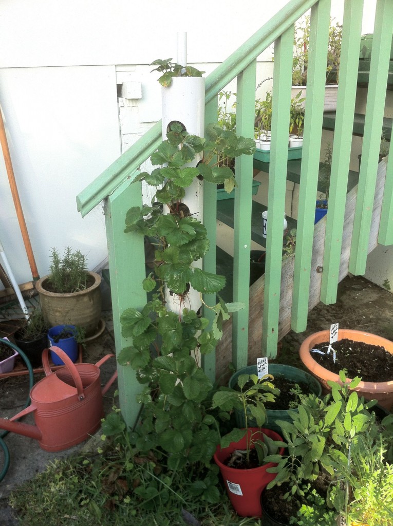 For the lowest hole I recommend planting a companion, less incentive for pests to climb up. If you are using stoloniferous varieties (those strawberries that spread with runners along the surface) you can leave a few gaps in the lower holes. As the runners cascade down you can poke them into these vacant spaces. Saves a few bucks, huh? When filling, I found it easiest to pour the soil from the top and poke the plants in the holes. Make every 6th one a companion.
